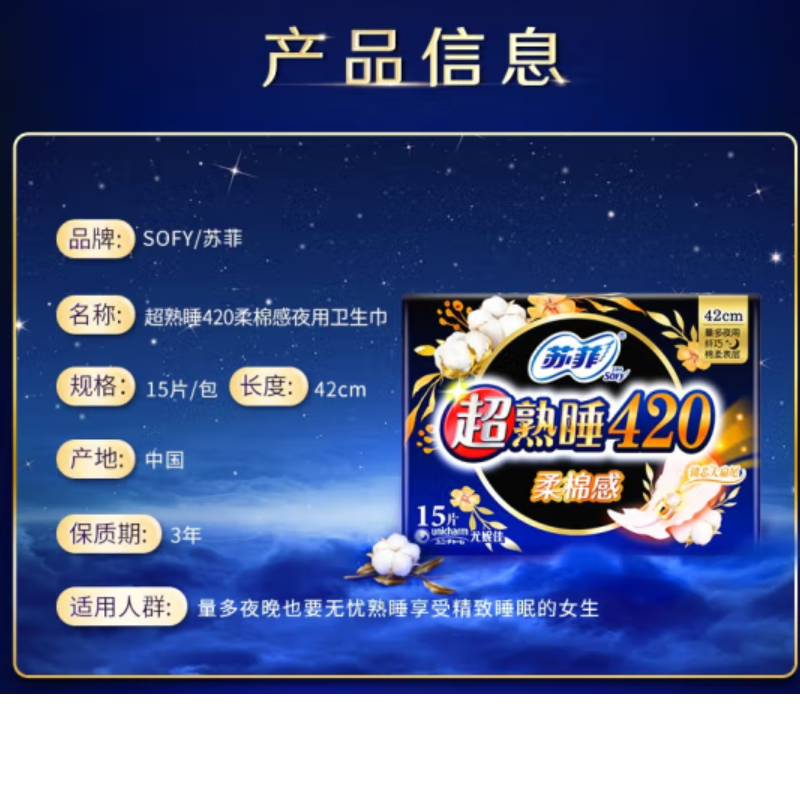 sophie Sofy ultra-sleep soft cotton feel extra long night sanitary napkin 420 mm 15 enlarged tail fan volume, anti-leakage, 420 no specifications