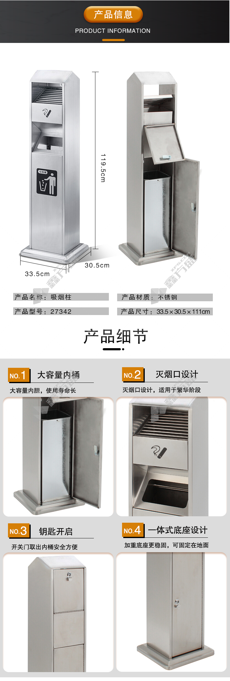 ansery 27342 stainless steel ash column 27342 33.5 *30.5*111cm true color without specifications