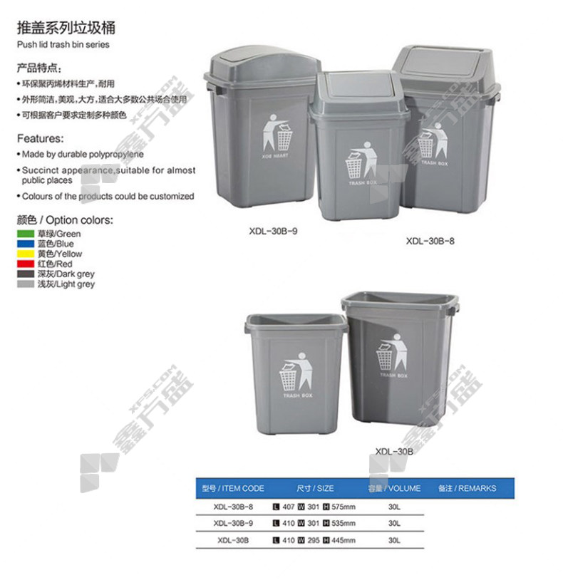 huyang high quality push lid series indoor and outdoor trash cans 30 L recyclable 410 *295*445mm blue recyclable /407*301*575mm/blue