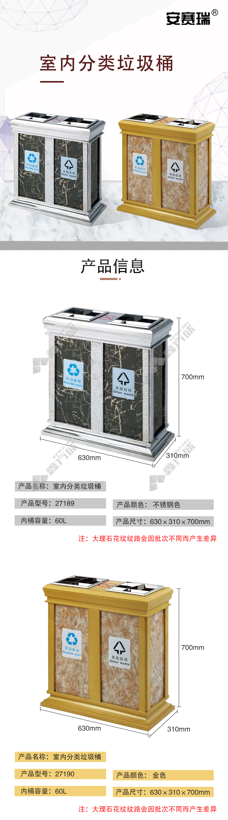 ansery 27189 indoor classified trash can 27189 stainless steel color 630 *310*700mm 60L no specifications