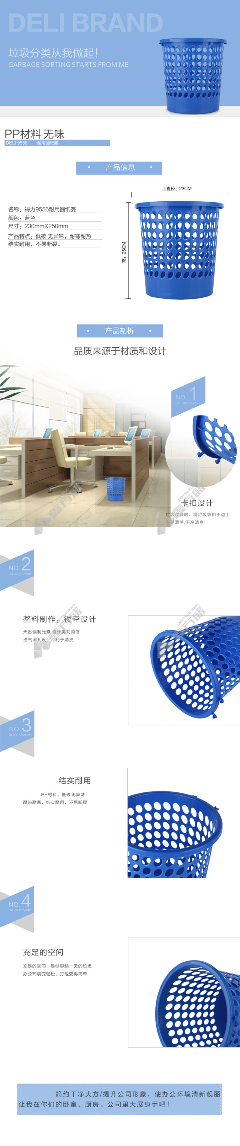 deli 9556 round wastebasket (blue )(only ) - no specifications