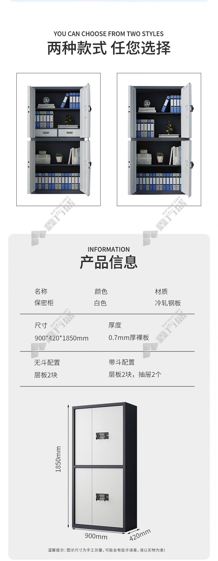 qinuo QNGCFO-02ZWGW double section safe cabinet 900 *420*1850mm gray framed white door no specification