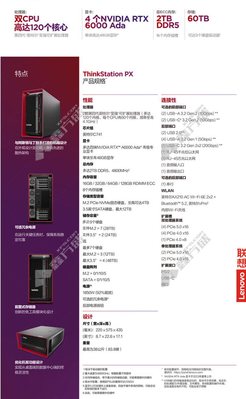 lenovo ThinkStation workstation PX graphics workstation 2 *4410Y 2.0GHZ 12 nuclear /512G DDR5 fully buffered /2TB M.2+32T /graphics card RTXA6000/with optical drive /DOS/2*1850W black no specification