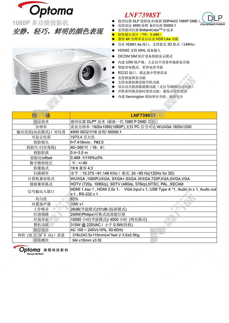 optoma LNF7398ST projector manufacturer standard configuration LNF7398ST 1080p standard white, no specifications