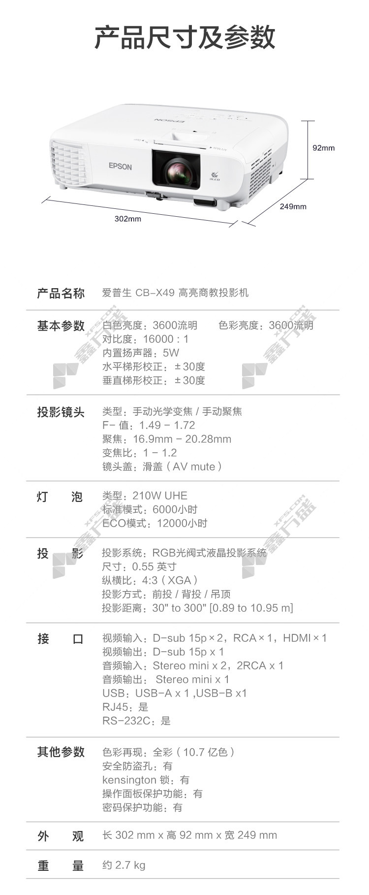 epson AG business office hanging projector CB-X49/3600no specification for lumens