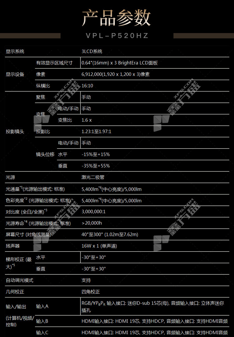 sony VPL-P520HZ projector manufacturers come standard with 5400 lumens VPL-P520HZ no specifications