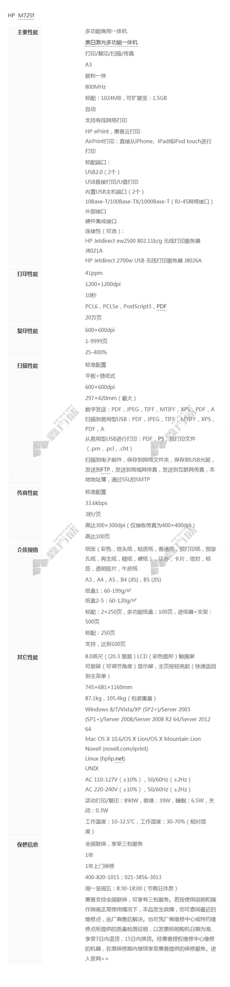 hp ( HP) M725f black and white laser multi-function machine M725f A3 no specifications