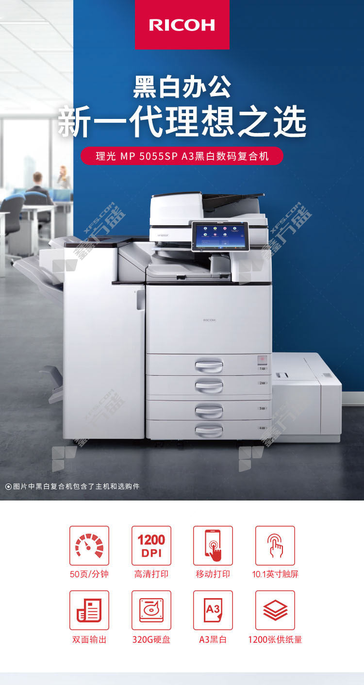 ricoh MP 5055SP A3 black and white laser composite machine option 1 MP5055SP includes duplex document feeder +dual paper box assembly +base cabinet +binder +bridge unit has no specifications