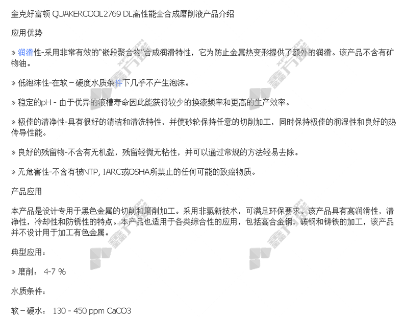 quaker houghton high performance fully synthetic grinding fluid QUAKERCOOL 2769 no specifications