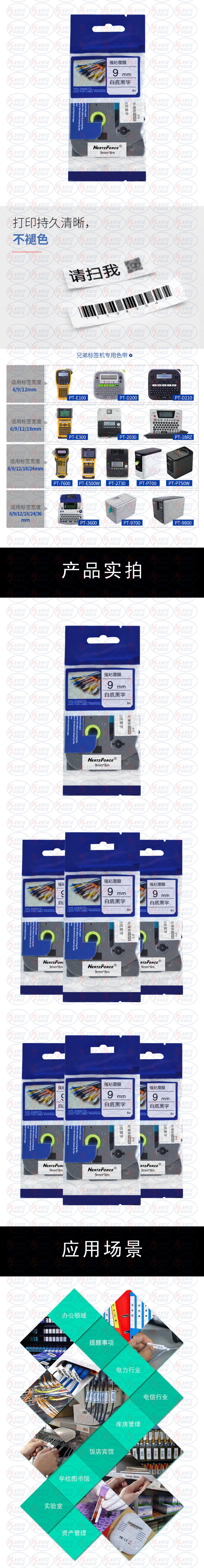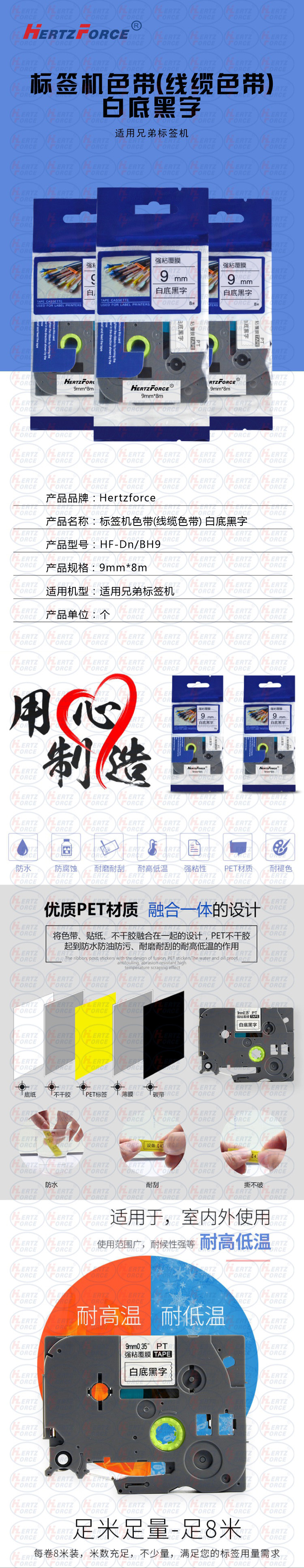 Hertzforce label machine ribbon (cable ribbon ) black text on white background HF-Dn/BH9 9mm*8m applicable brother label machine unit: pc HF-Dn/BH9 no specifications
