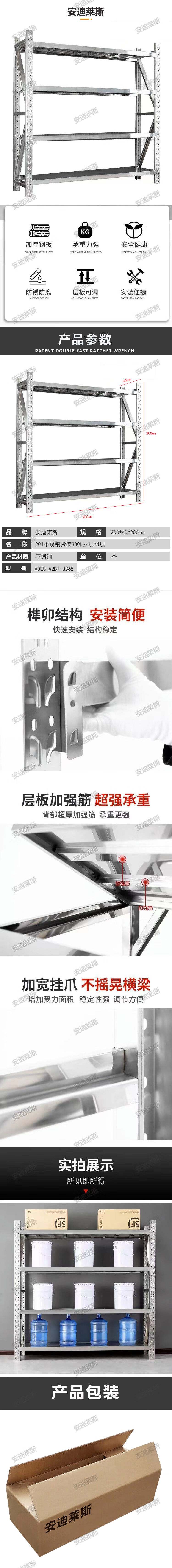 andy rice 201 stainless steel shelves 330 kg/layer *4layer ADLS-A2B1-J365 200*40*200cm ( unit: pieces) ADLS-A2B1-J365 no specifications