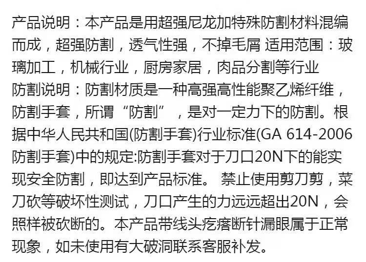 订购的防护手套己经收到了,跟描述的一样,戴上手套感觉不紧绷,舒服。
