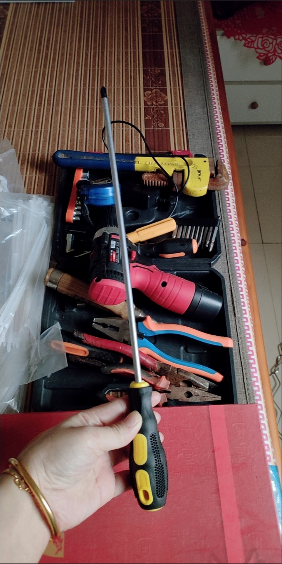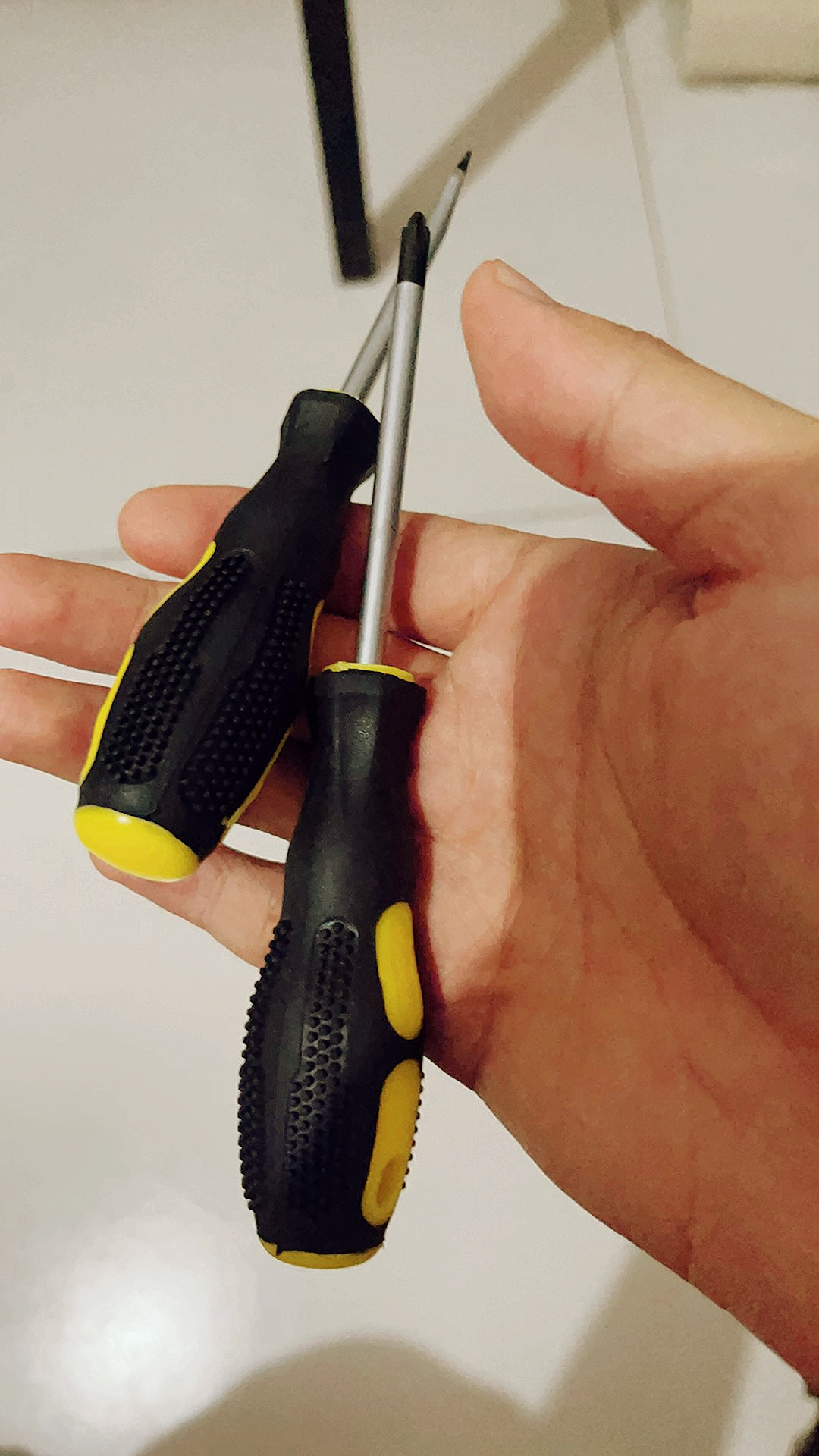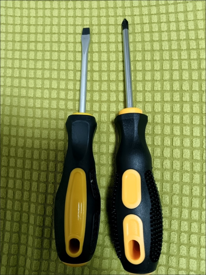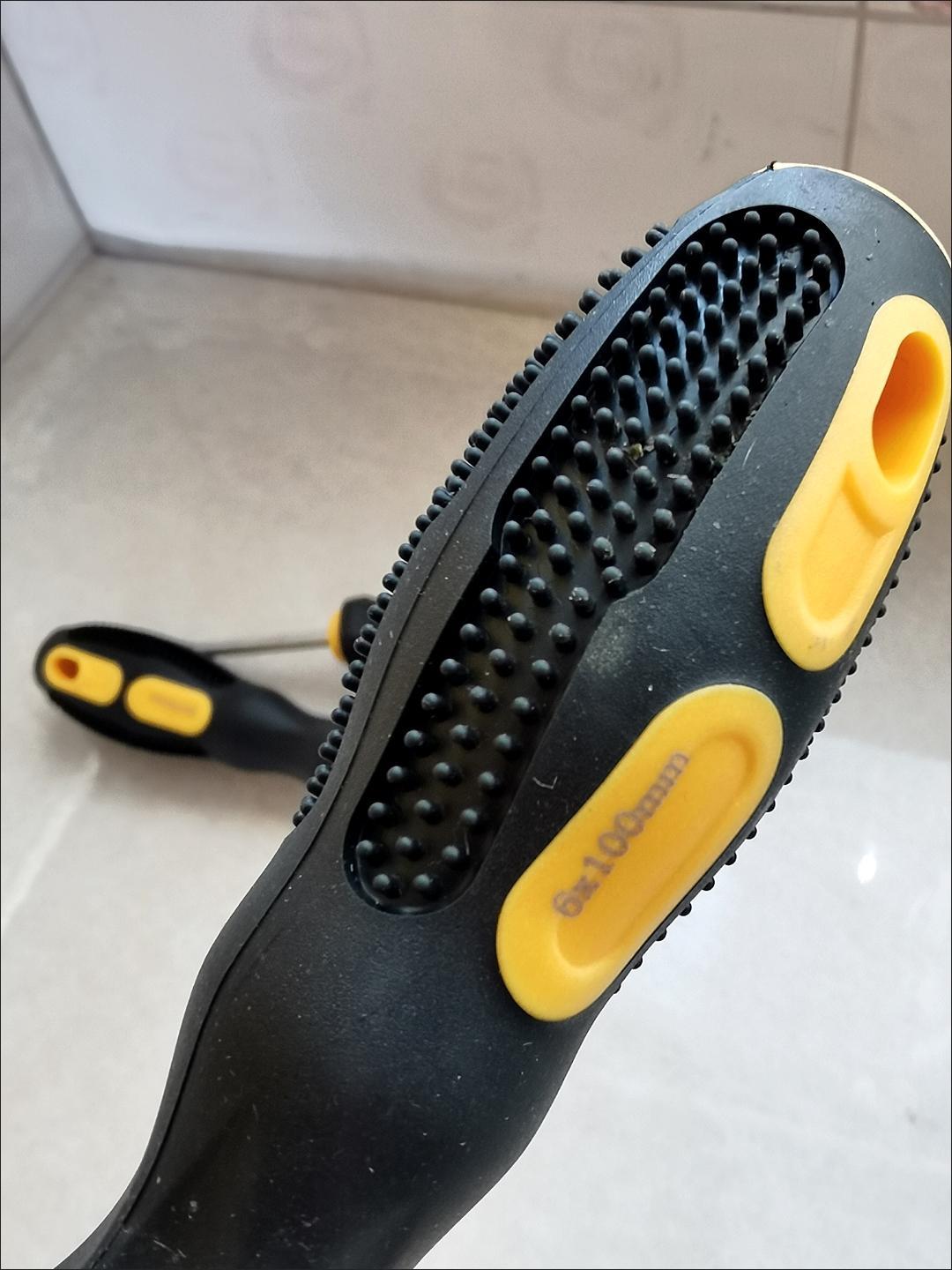 螺丝刀真的很好用,螺丝刀手柄是那种橡胶材质的。握起来很顺手,不会打滑和伤手。比那种硬塑料的强太多。螺丝刀头有吸力防掉螺丝掉落;螺丝刀头有黑色增加受力材质。不会轻易划丝。推荐
