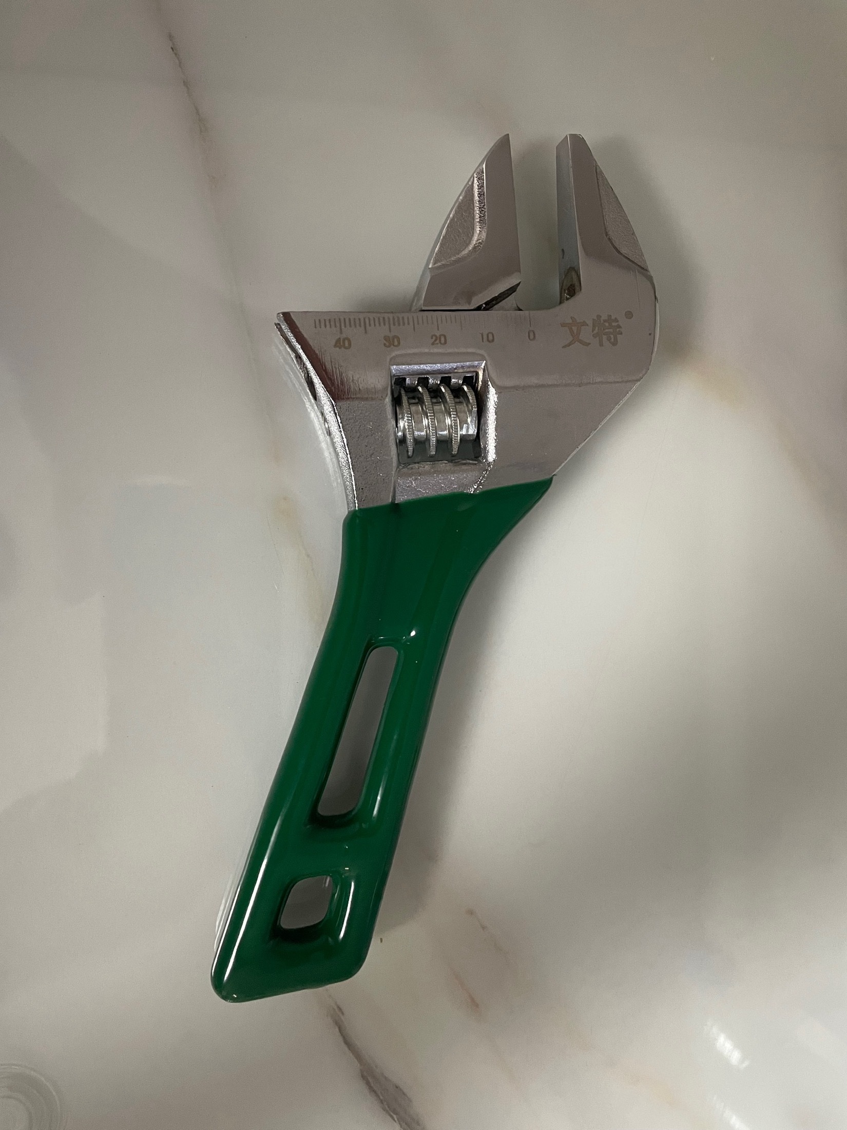 由于自己维修卫浴设备的需要,曾经购买了铝合金的宽口扳手,使用很方便。又想购买一款更牢固结实的钢制宽口扳手。经过再三挑选,反复比较,选中了性价比合适的文特宽开口扳手。收到货后,感觉该扳手价格实惠,造型美观,既牢固又轻便;调节螺杆转动灵活;最大开口超过规格1mm,达到47mm,非常符合我的要求。其品名标识清晰且不可轻易去除,明显是正品,我很满意!
