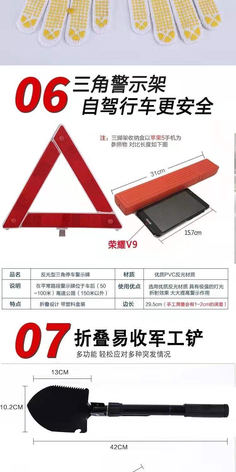 三角牌摆放很稳,拉车绳也结实,小小的灭火器和应急锤也不错,应急四件套便宜好货值得购买。