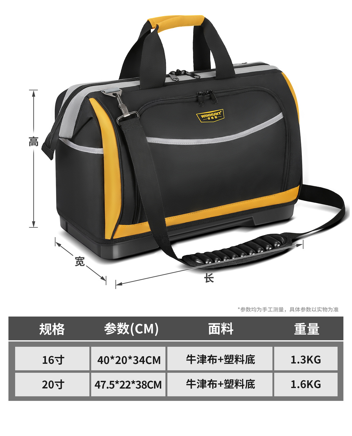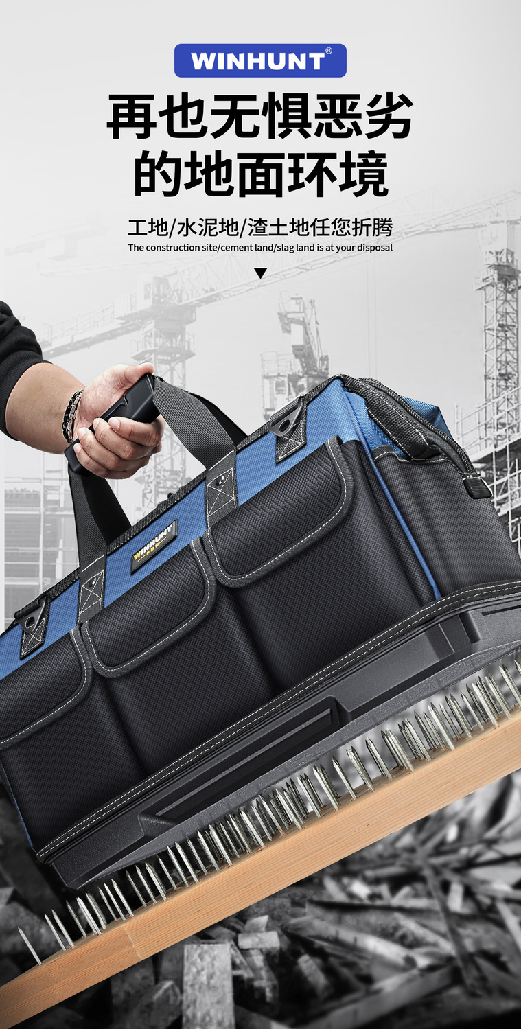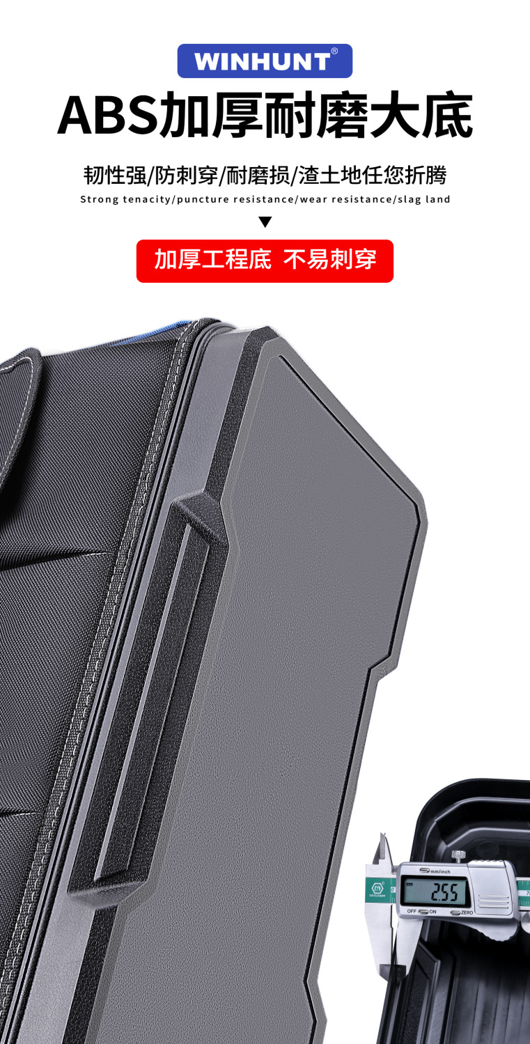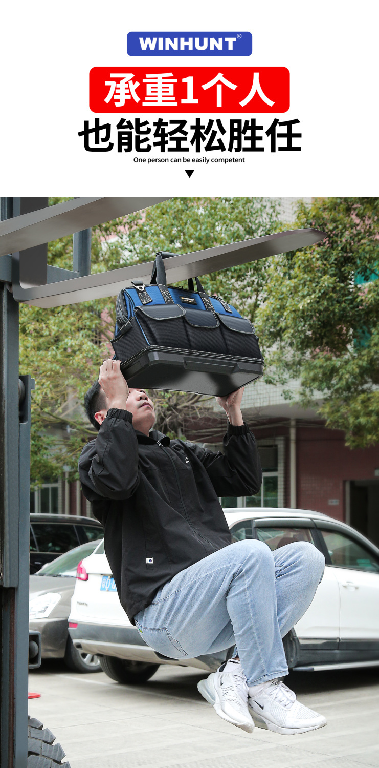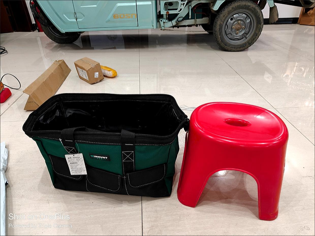 这个包的容量很大,跟这个板凳相比,放下一个锂电锤和角磨机电钻都可以放进去。