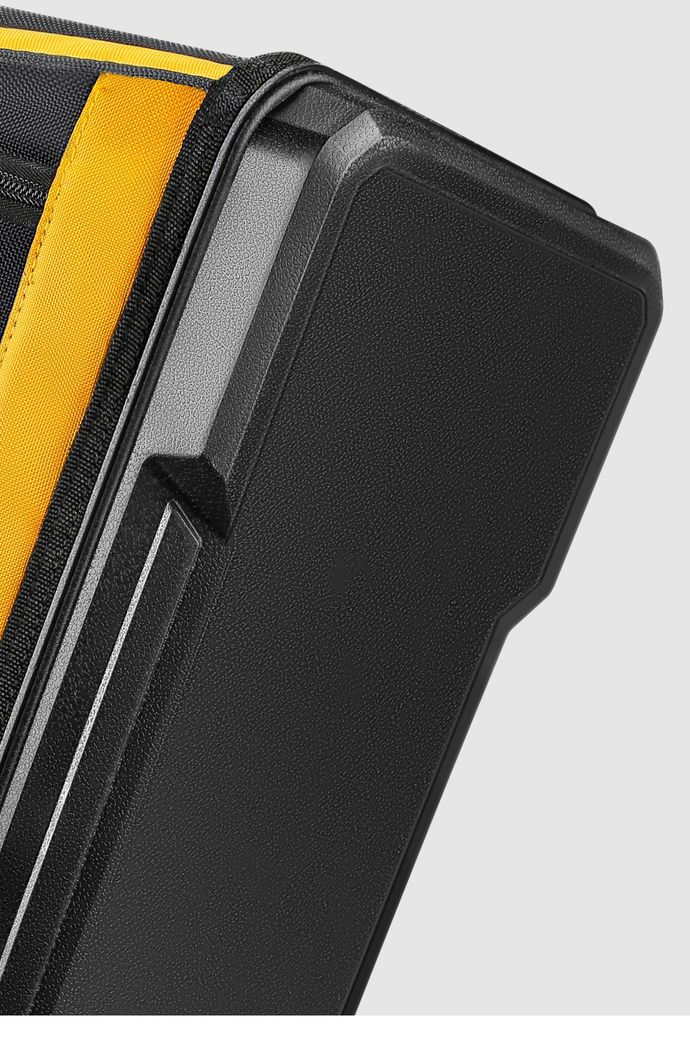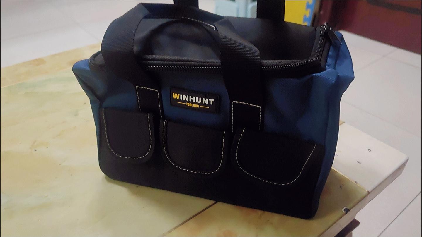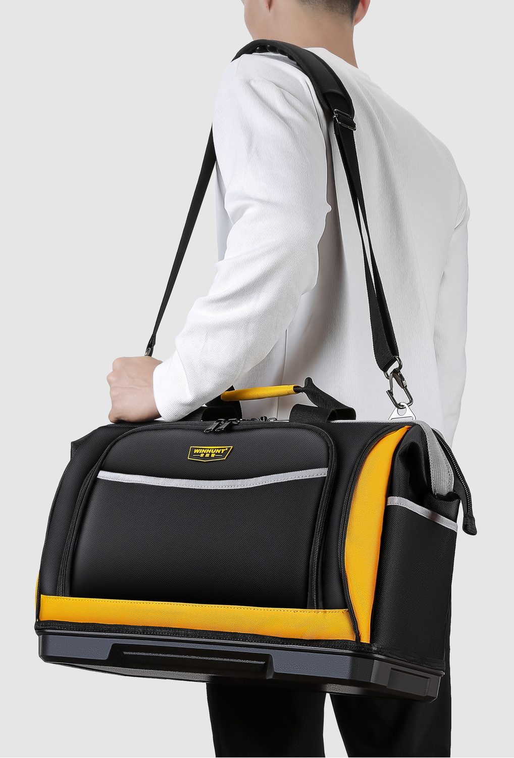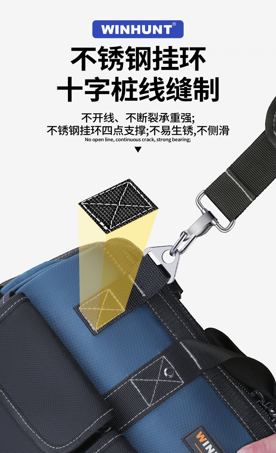 这个包的容量很大,跟这个板凳相比,放下一个锂电锤和角磨机电钻都可以放进去。