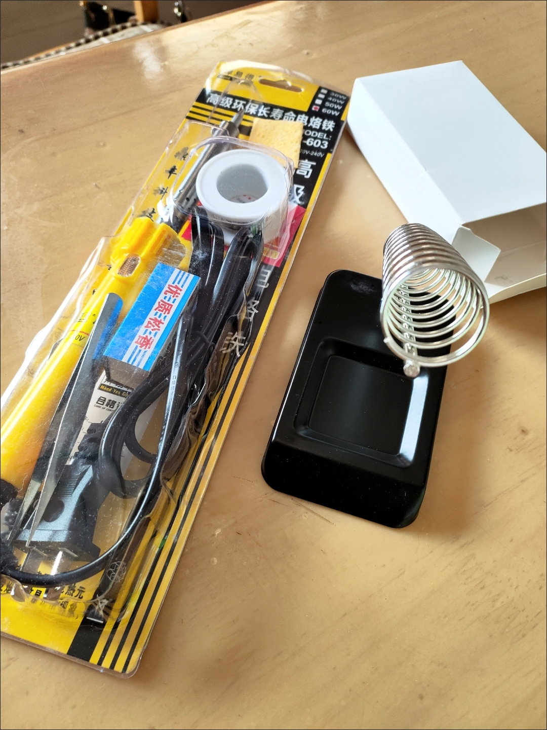 电烙铁收到了,包装很好,插电试了一下,发热快。支架,松香,焊丝,夹子等全套物品,家用足够,焊接小物件非常方便,有需要的朋友可以考虑!