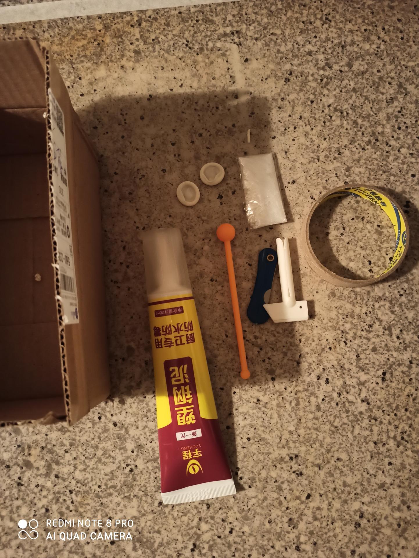 发货好快,两天就收到了,打开包装更惊喜,好大的两支胶管,口还用塑料盒子盖得好好的,送J一大堆实用的工具,谢谢老板这么用心,不用说,塑钢泥一定质量好,用过再来追评,会回购。