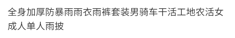 雨衣收到非常满意,物美价廉,在超市买要百十块,在此只有三十元不到,下雨浇地穿上不再衣服湿了,给个五星好评