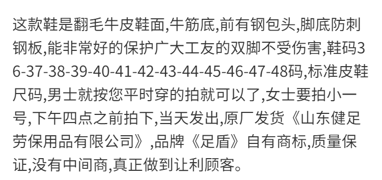 合脚体验:尺码标准,穿着很舒服!牛津底,走路有抓地感!做工很好,可以当做休闲鞋穿。鞋子的前面加有护脚的钢板,可以有效预防砸伤事故的发生!物美价廉!很满意,好评!