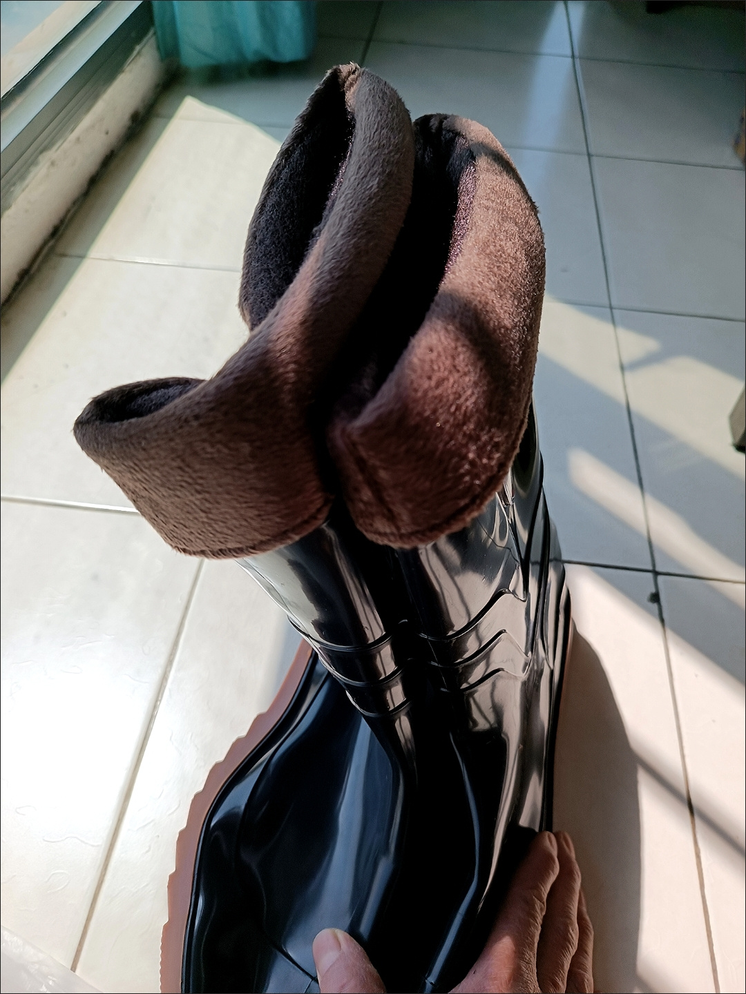 这雨靴瘪瘪蹋蹋变形了,在实体店可能不受青睐。我之前也买有这种因包装跻压变了形的长筒雨靴,穿一段时间就自然恢复挺立了。我拼的这双中筒"军津牌"的雨靴是大一码的(我脚平常穿40码的鞋,考滤冬天要装厚袜子,所以这次故意拼一双加大一码的雨靴),这双雨靴性价比高,又是牛筋底的,穿上很轻爽舒适,我对这次网购拼单很满意!