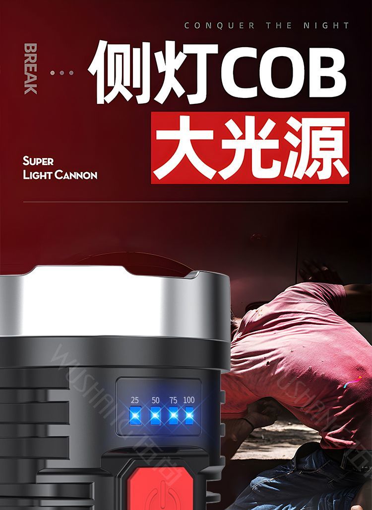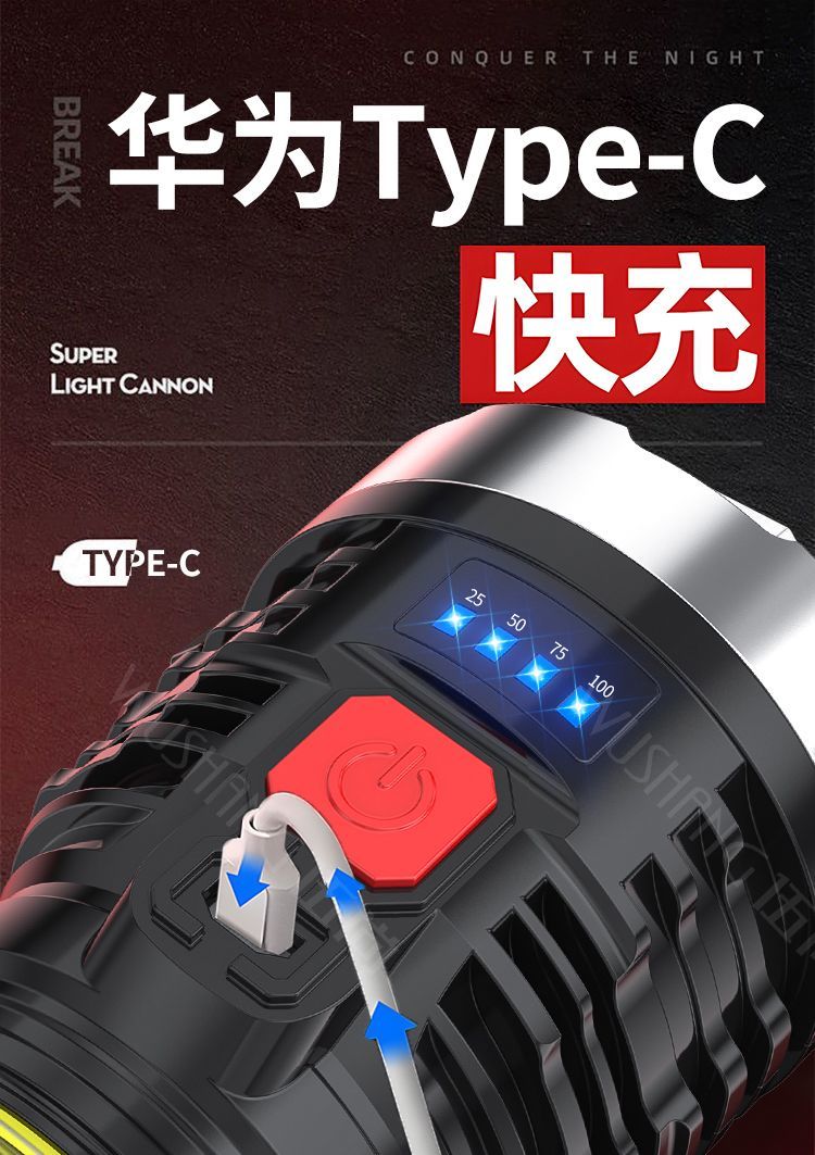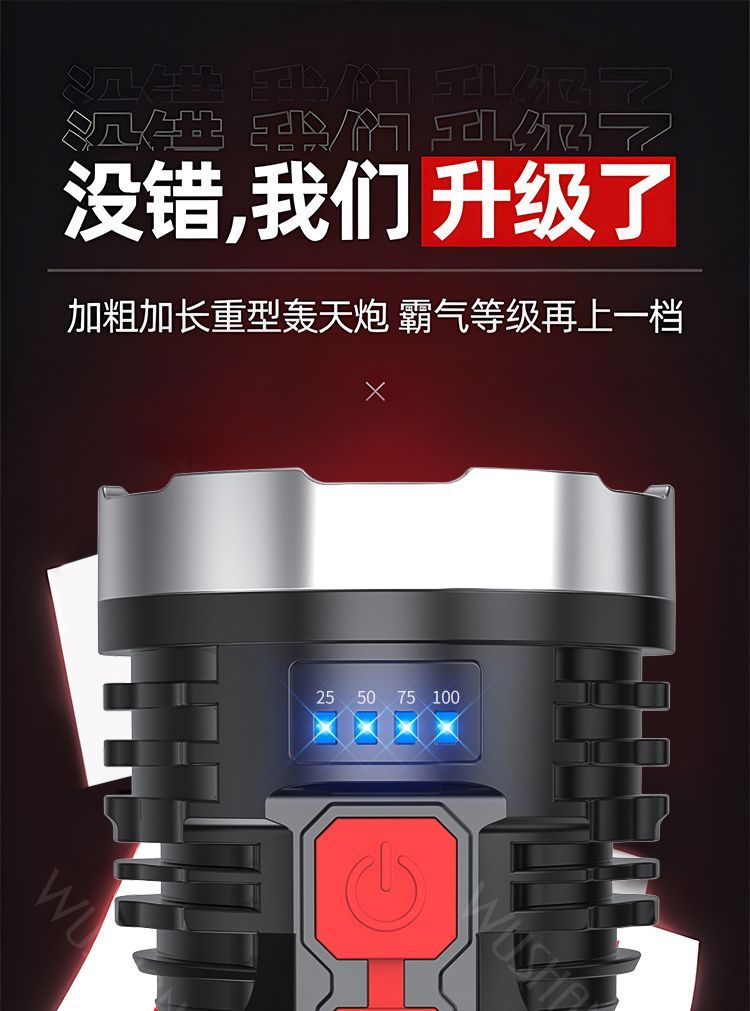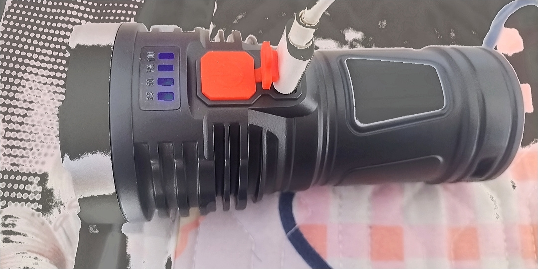 强光手电。多珠发光,亮度高,多功能发光,用处大,有电量显示窗,配有uSB充电线,充电快,材质好,做工细,希望耐用