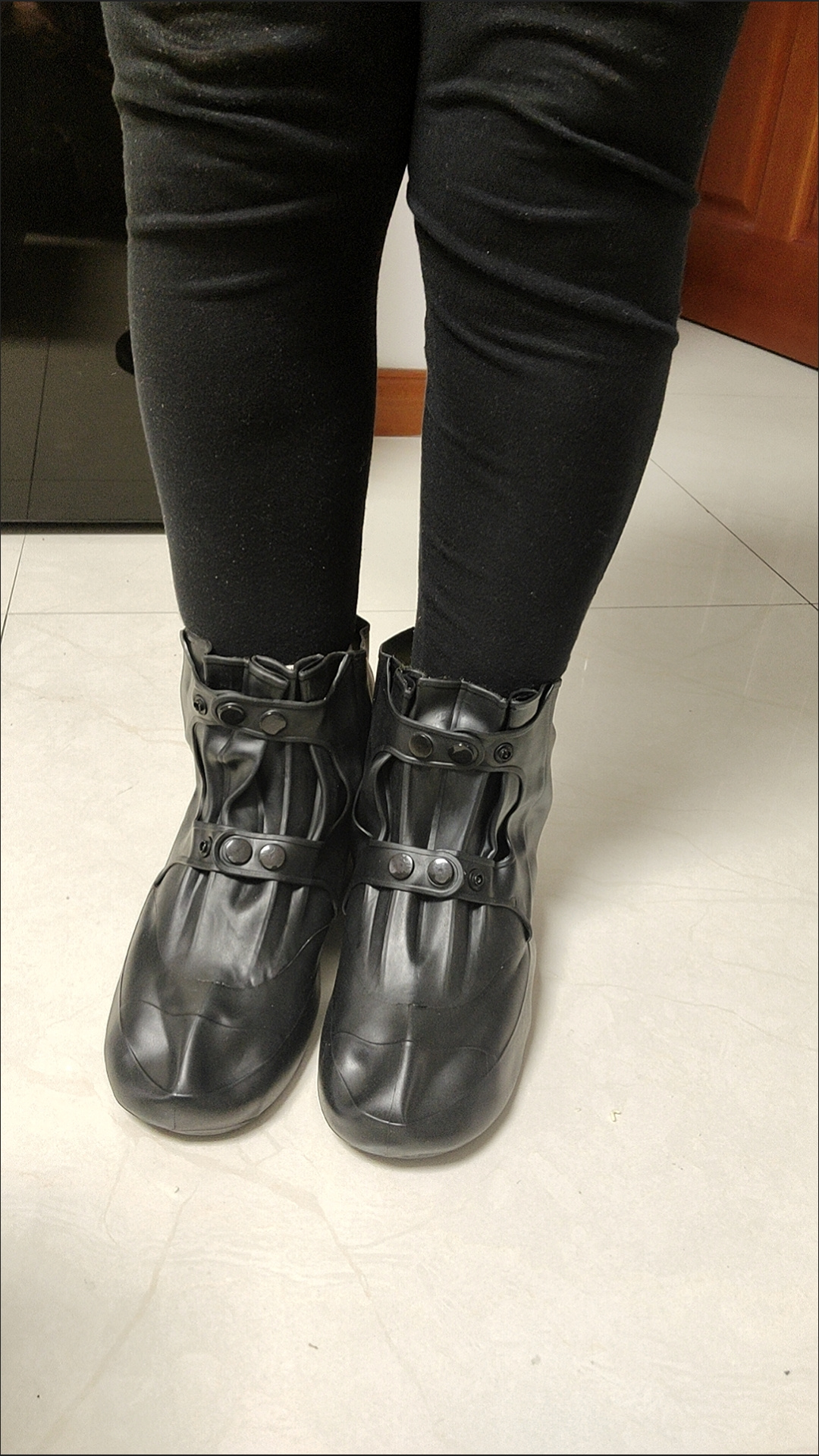防水鞋套收到了,质量特别好,无异味,设计合理,三排按扣,正好把脚脖包上,非常满意的一次购物,物流也快,给五星好评,想买的可以放心的购买