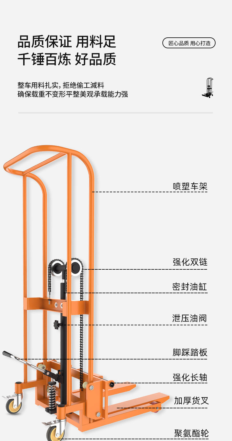 材质很好,结实,外观设计合理,堆高车升降平稳,容量大,实用方便。