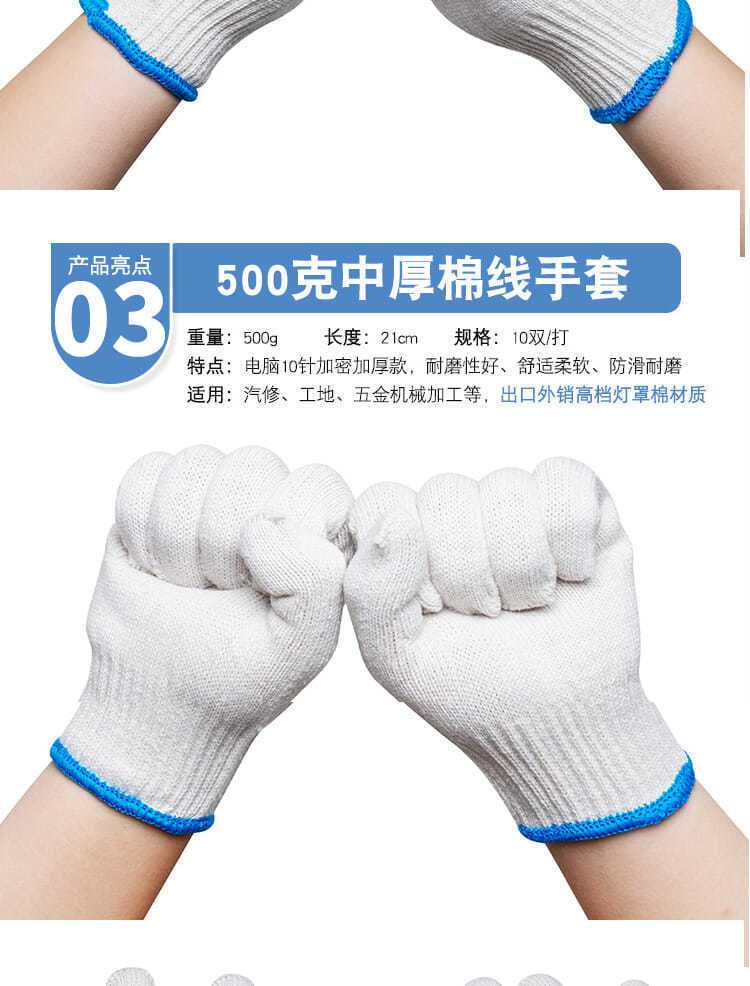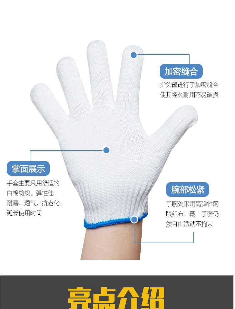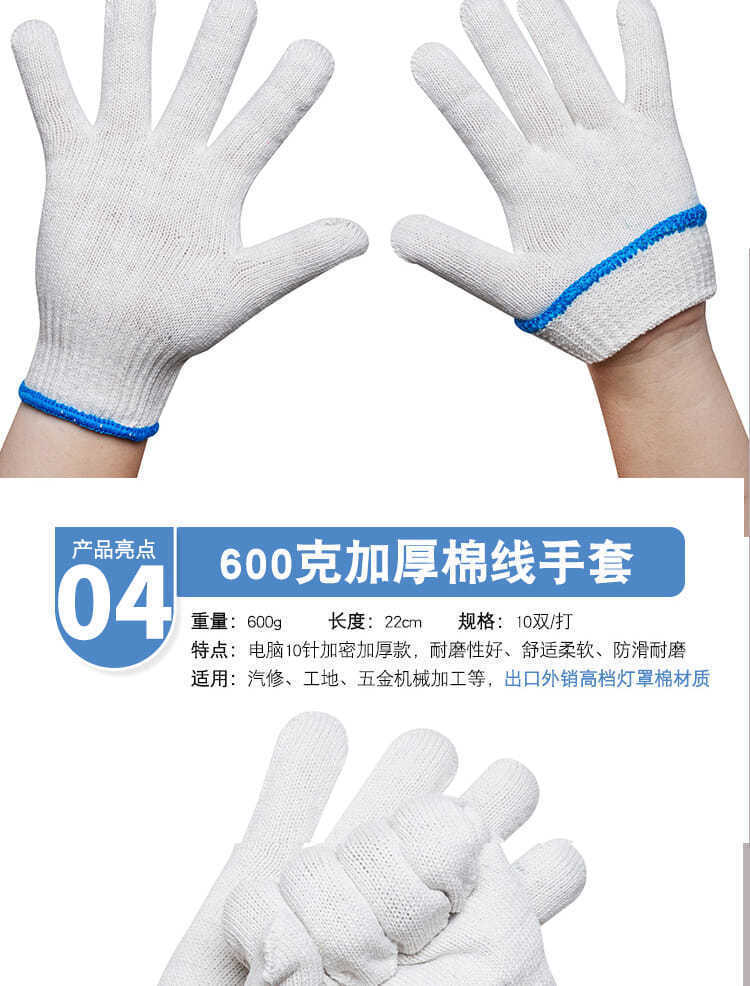 线头很少,纯棉透气,干活适合,手套厚实,大小号都正好,做工精细,包装完好无损,物流速度快,商家服务态度好,五星好评