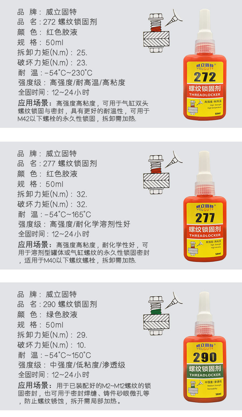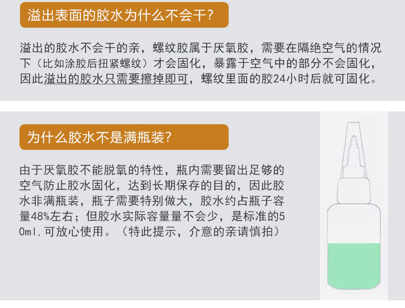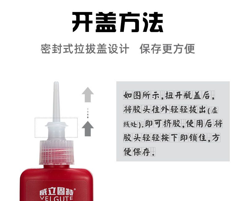 螺纹密封固定胶,包装规范,使用说明具体详细可操作性强,价格亲民,2元多钱一瓶,很适合家用。客服专业性很强,有问必答,服务态度无可挑剔,物流按时送达。