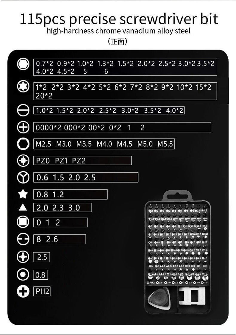与描述的一致,115合一工具套装,材质上乘,做工精细,种类很多,规格齐全,硬度很好,操作顺当,实惠实用,滿意好评!