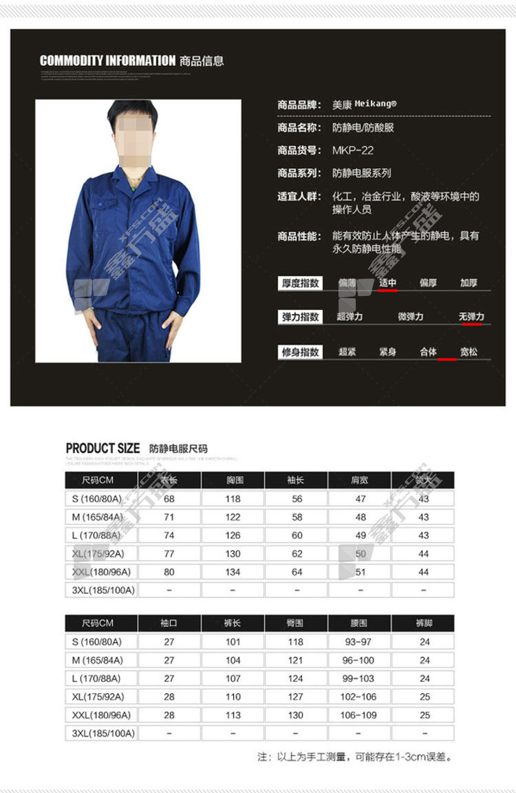 meikang MKP-22 acid and alkali resistant anti-static work clothes MKP-22 M size tops and bottoms MKP-22/S size tops and bottoms