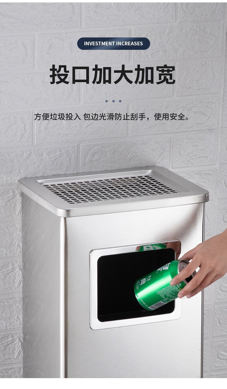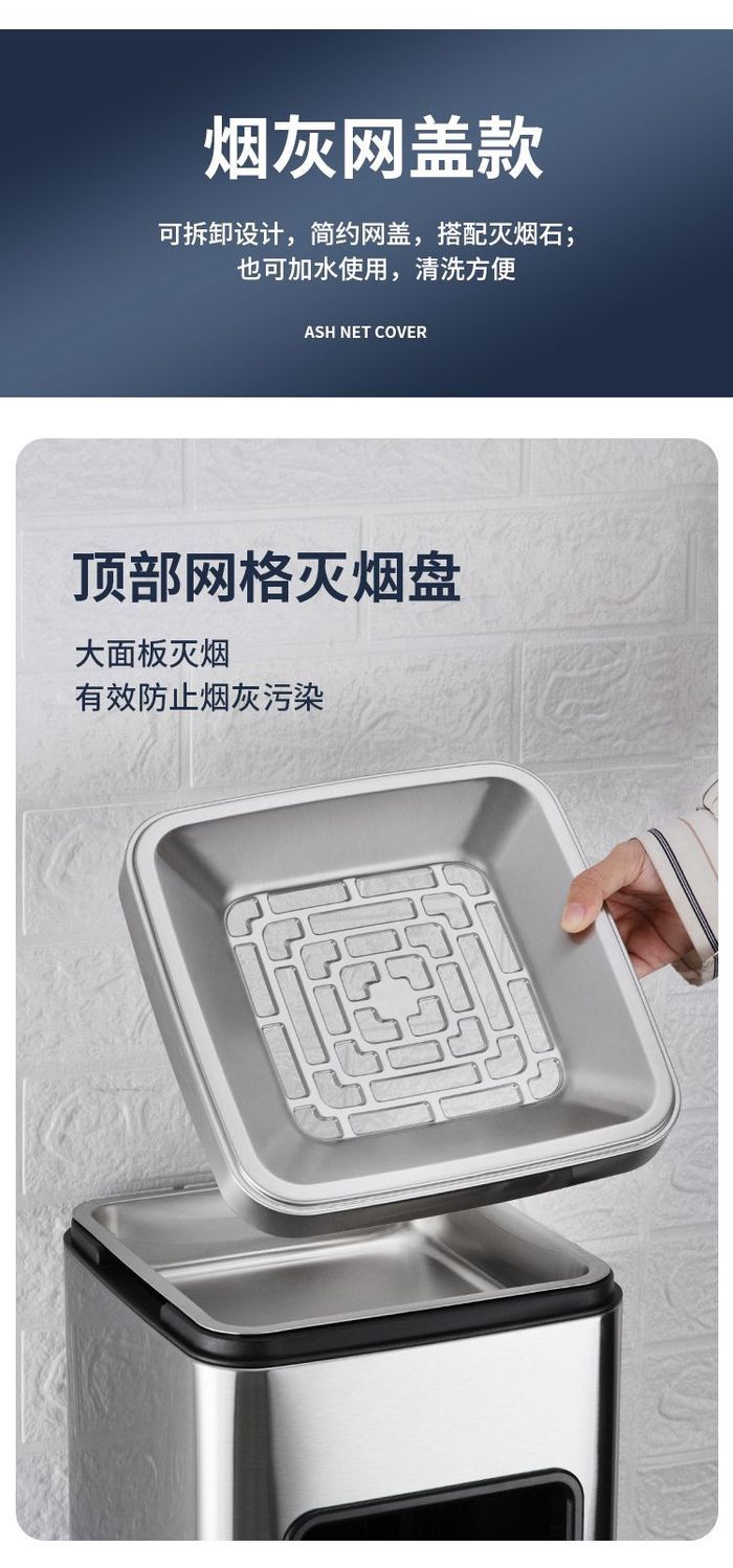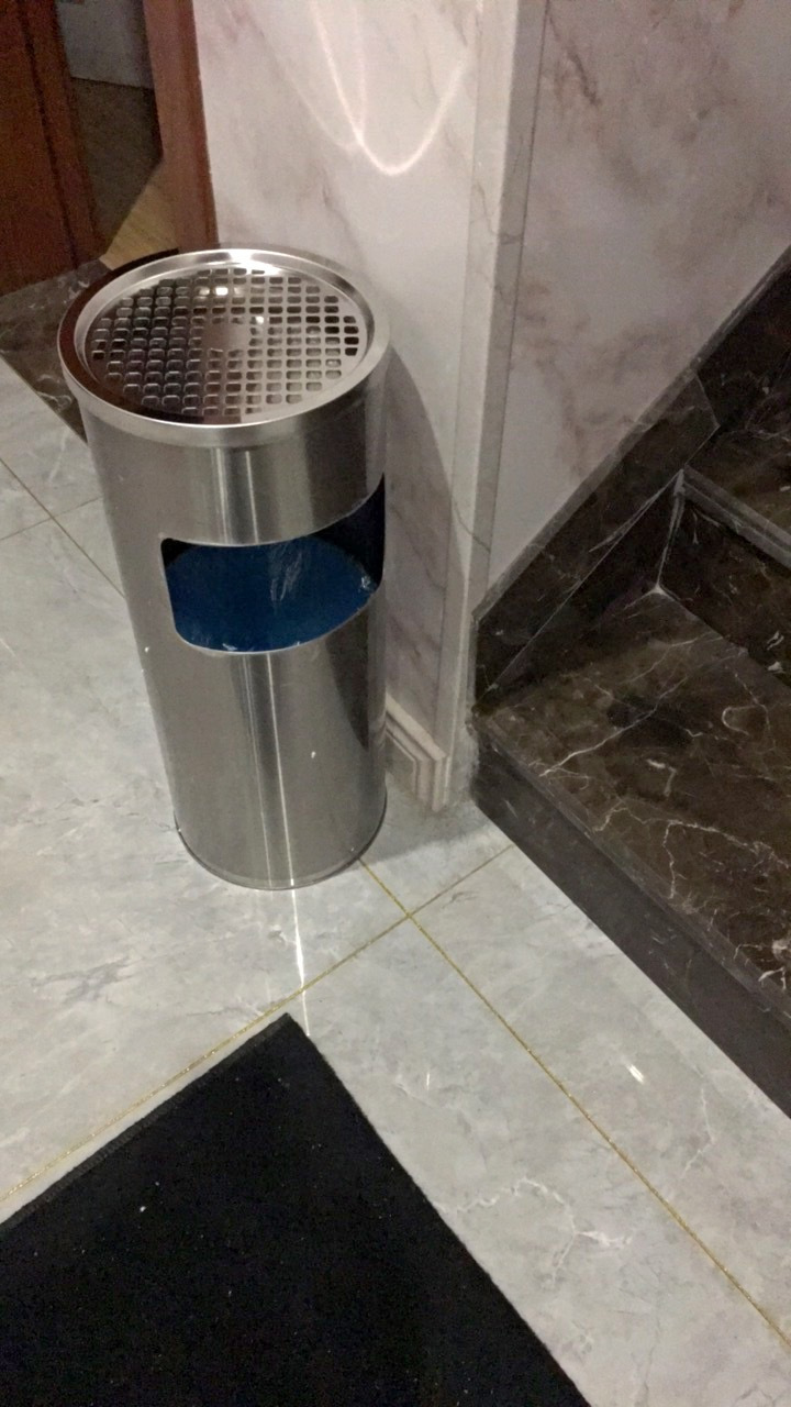 质量很不错的一款立式烟灰桶,表面光滑平整上档次,应该是不锈钢,板材厚度也很厚实,边缘做过处理不会割手。