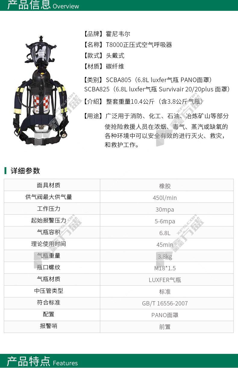 honeywell T8000 series respirators air respirators SCBA805 with gas bottle, without bottle, table has no specifications.