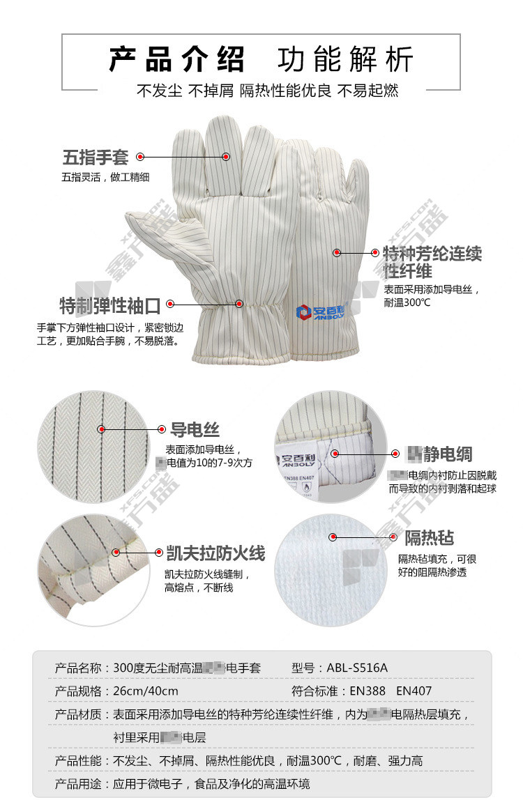 amberley 300 degree dust-free high temperature resistant anti-static gloves 26 cm ABL-S516A no specifications