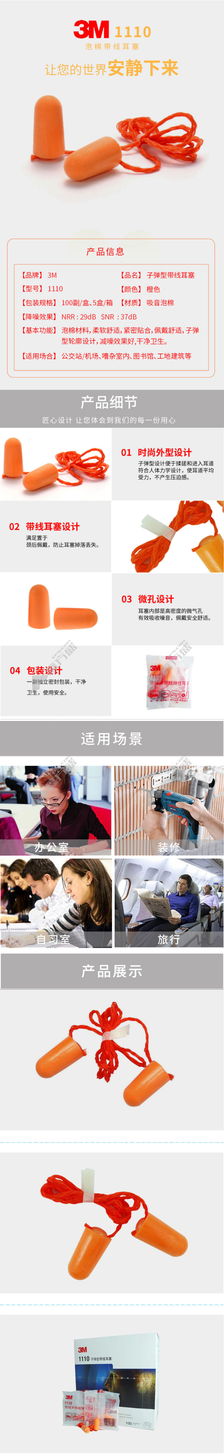 3M 1110 anti-noise disposable bullet-shaped foam earplugs with cord NRR:29dB SNR:31dB orange no specification