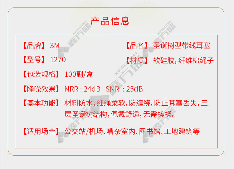 3M 1270 1 pair of christmas tree-shaped earplugs with wires, no specifications