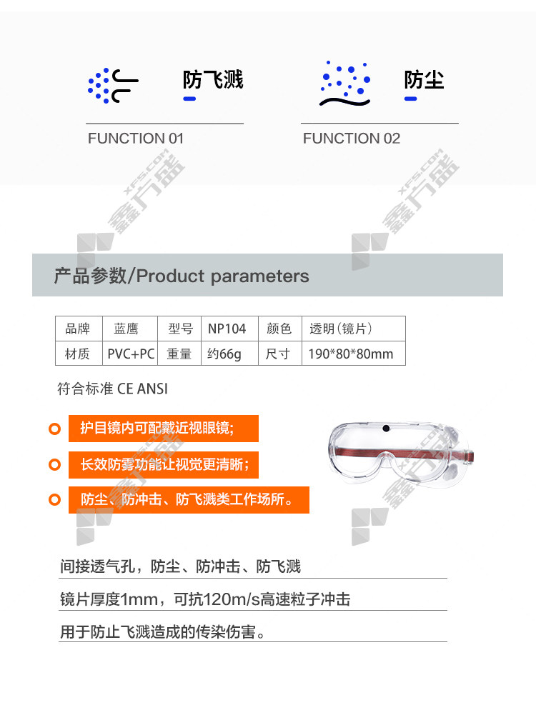 blue eagle dust-proof and impact-proof indirect breathable goggles NP104 transparent without specifications