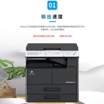 konica minolta black and white digital composite printer 205 i standard dual paper trays copy /print /scan 20 pages including 1 year original factory service /minute A3 no specifications