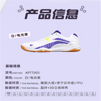 li ning table tennis shoes for men and women, professional non-slip rubber sole, wear-resistant APTT005-1 a pair of white /electric purple no specifications