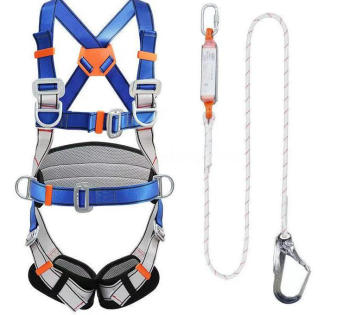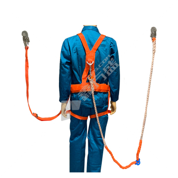 Full-body double-lanyard safety harness with two large hooks, red and blue, unspecified size. Full-body double lanyard safety harness with two-meter rope, red and blue, unspecified size.