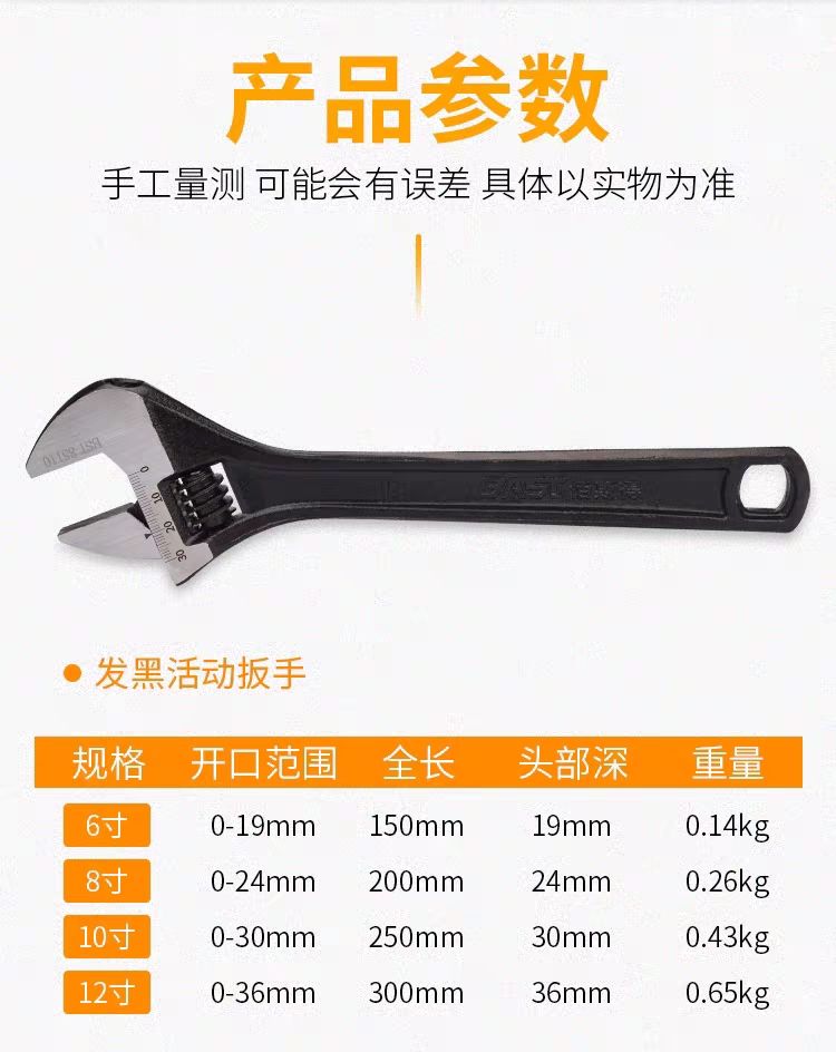 活动扳手收到了,到货很快。买大了一号,可以任意调节开口挺大的,使用了很方便,价格不贵,物美价廉五星好评!