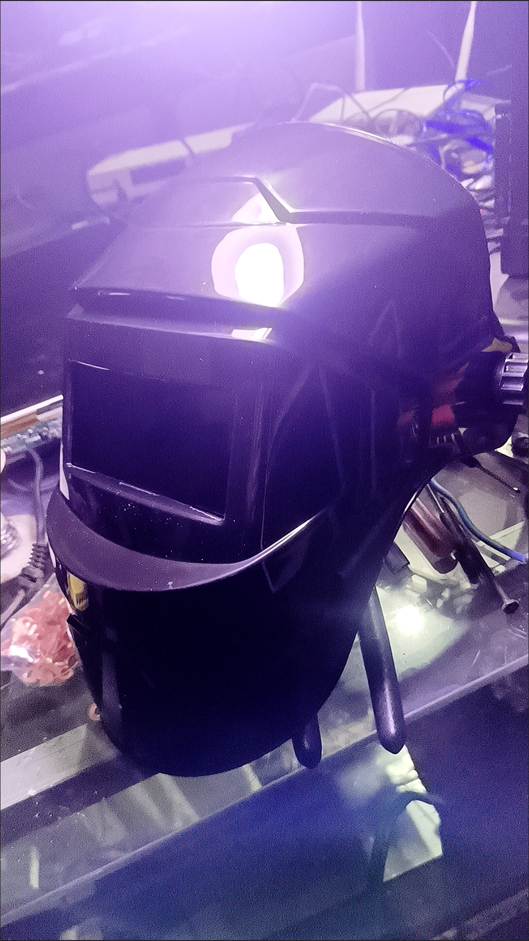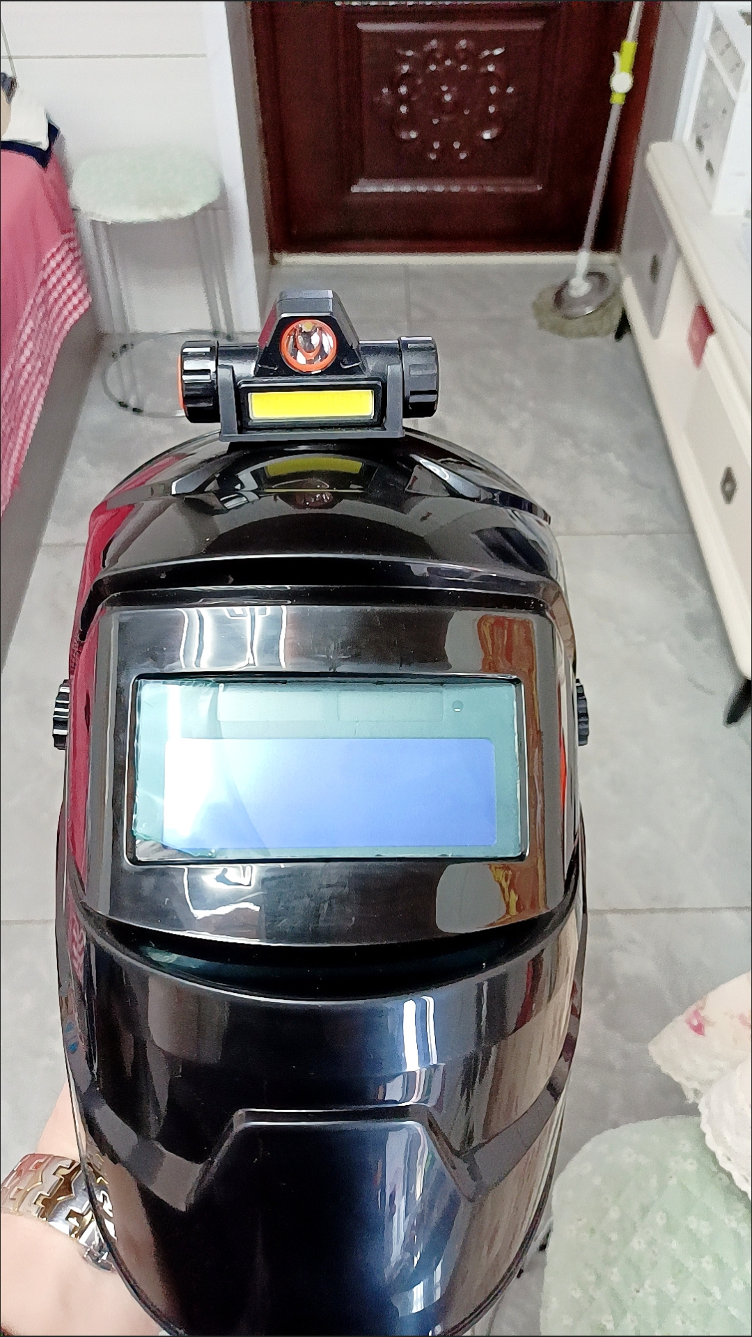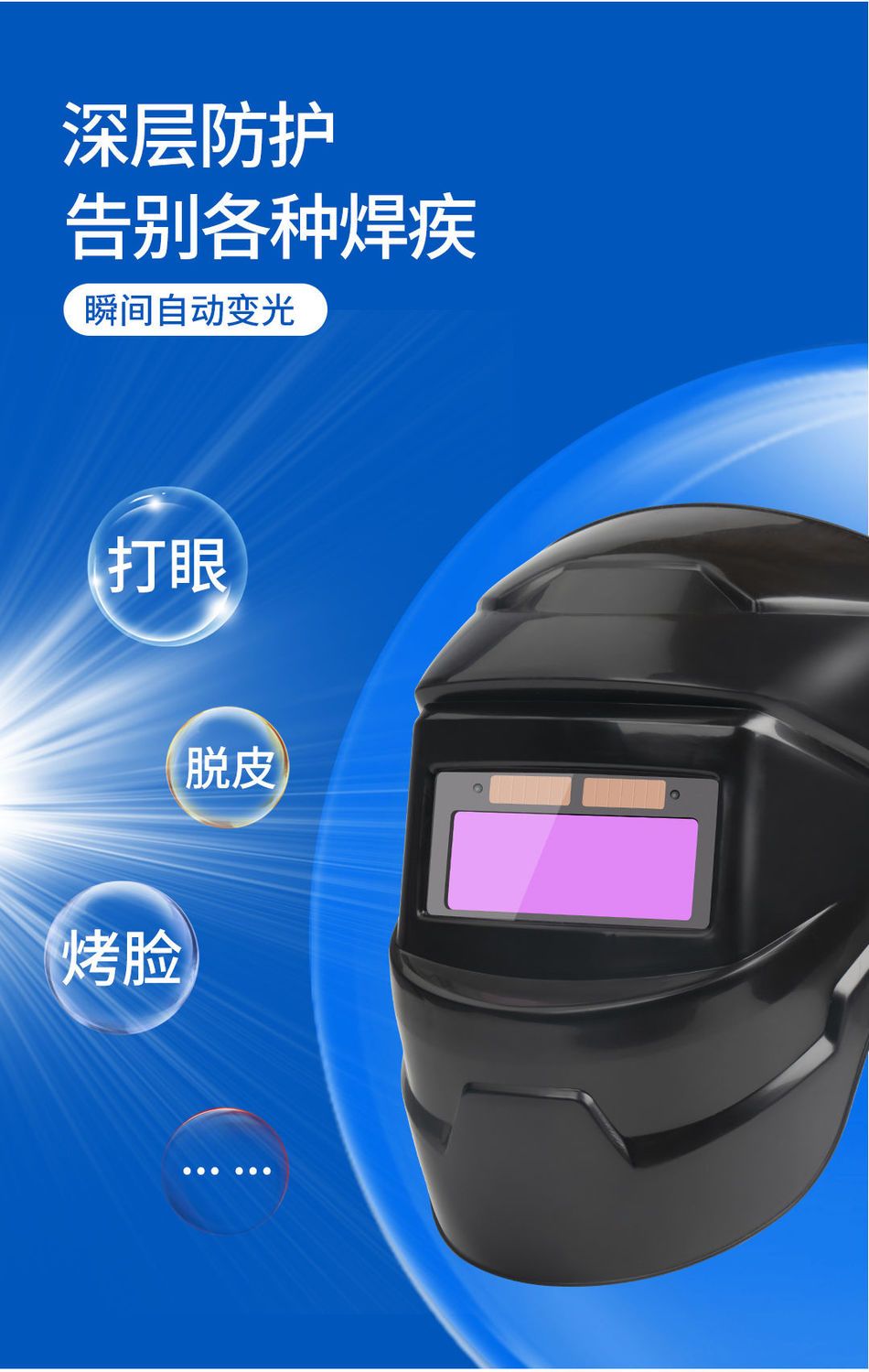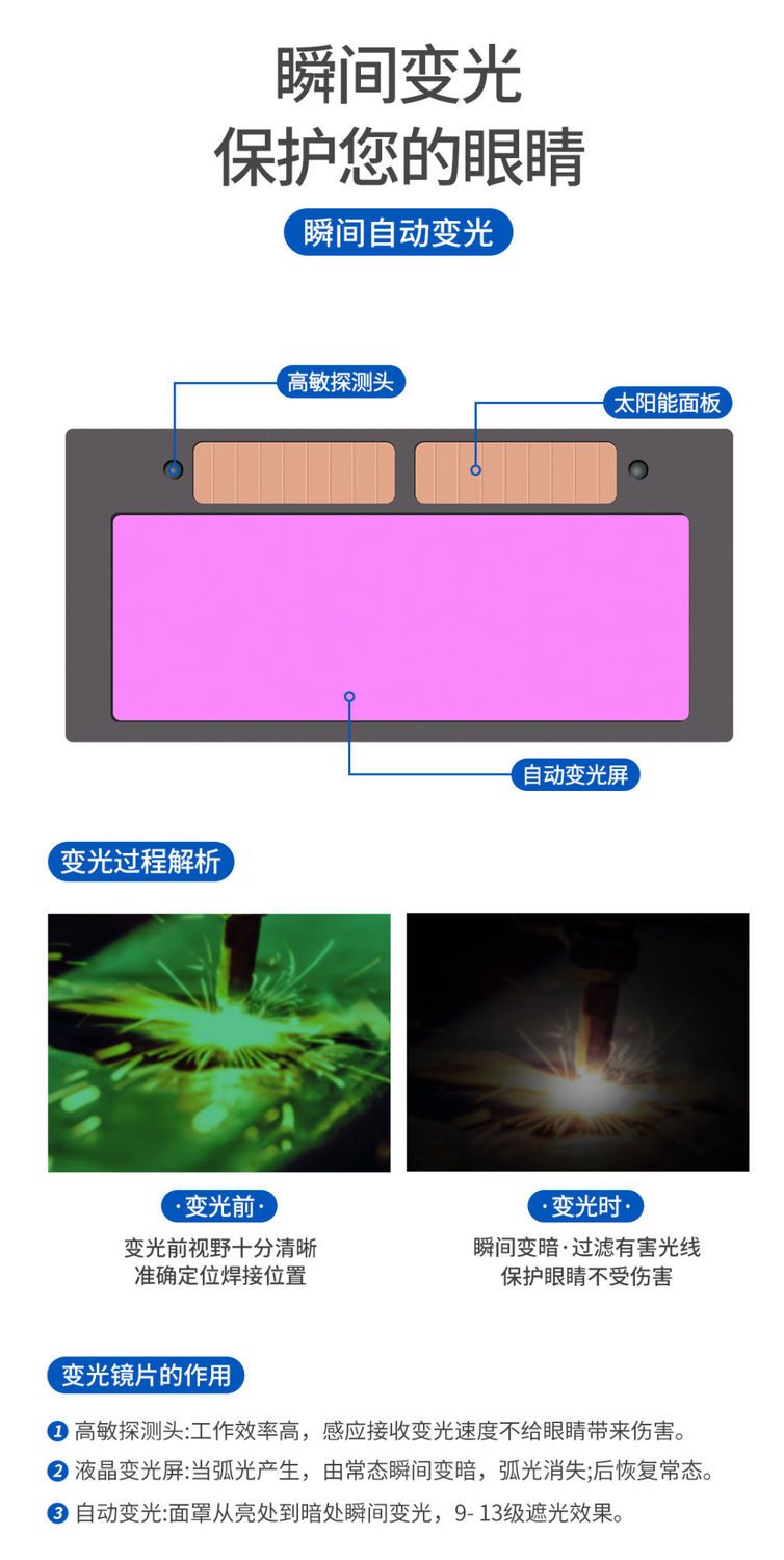 自然变光,电焊强光焊帽镜片立马变暗,只看到焊点,一停下来自己光明!很好用,还是太阳能充电!值得购买!