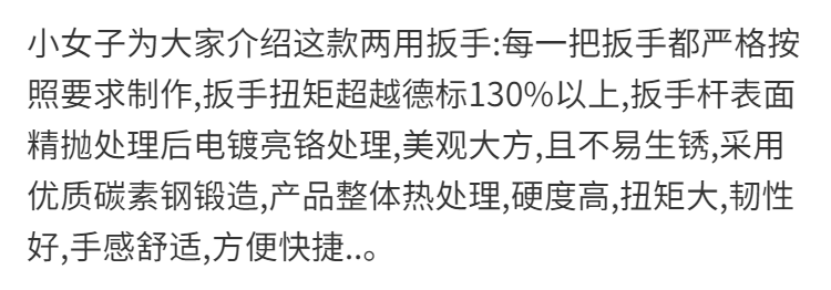 两用扳手很好用,材质好,耐用,第二次够买了,价格不贵值得推荐一下。
