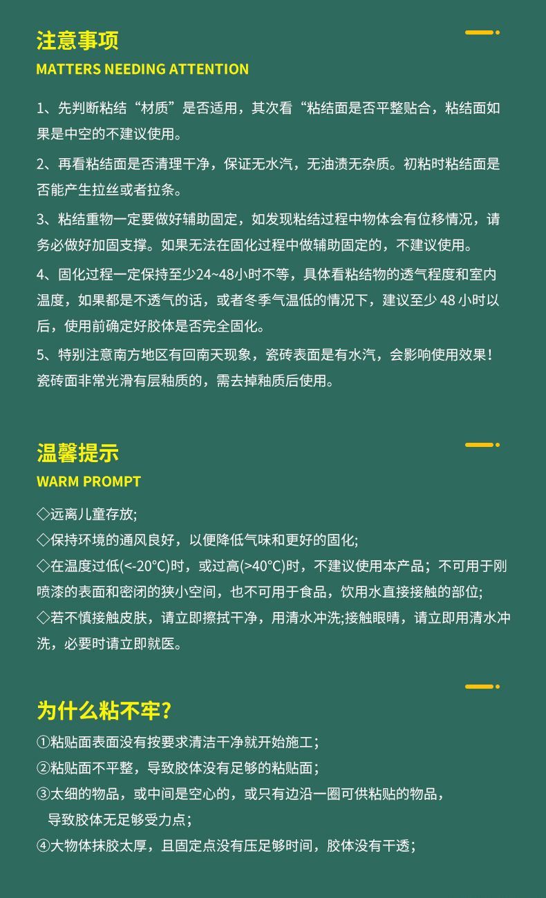 勉钉胶收到,质量不错、我用于粘贴墙内角装饰条、打上胶后对接好按住不要动、30秒内就固住、全干后非常牢固。