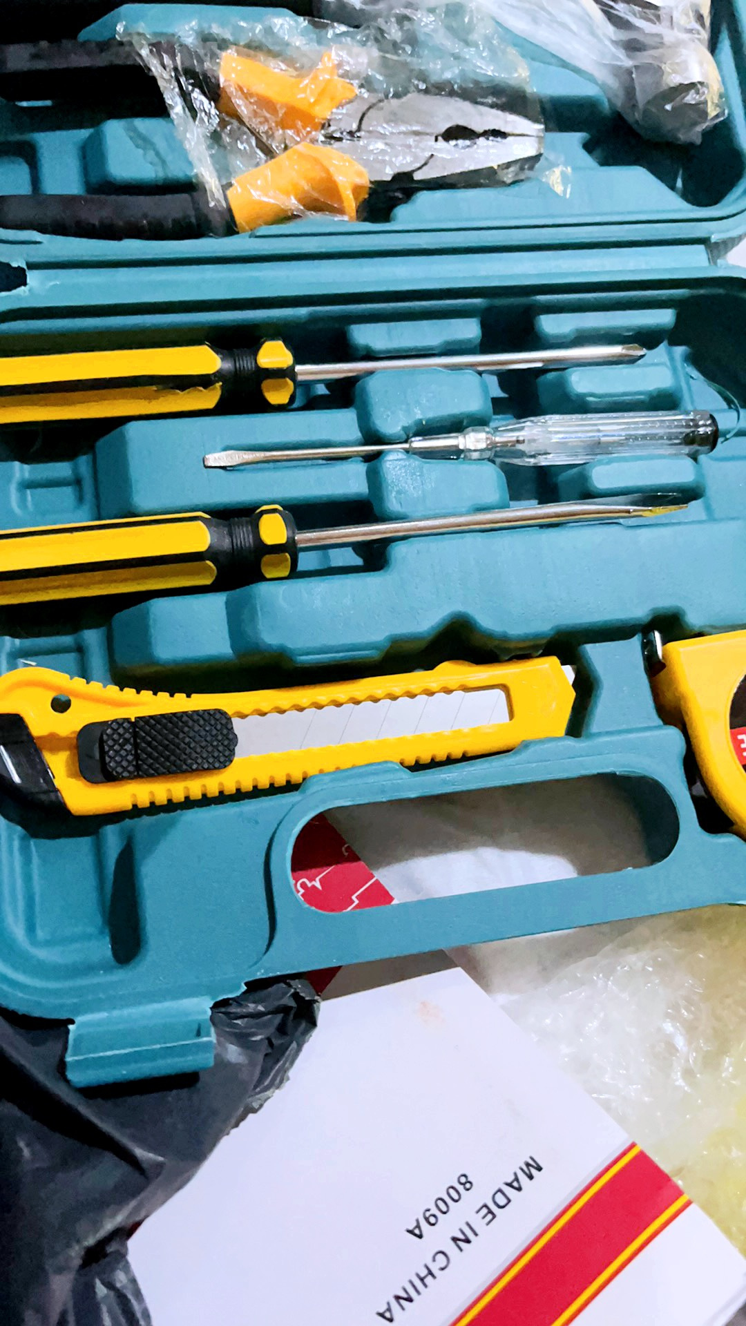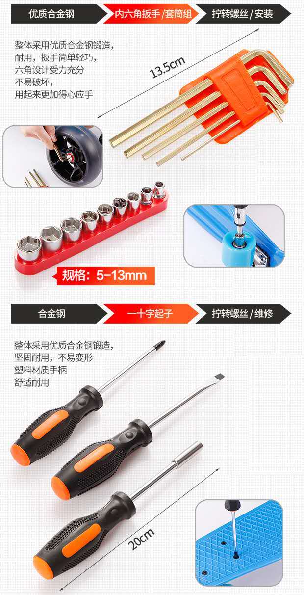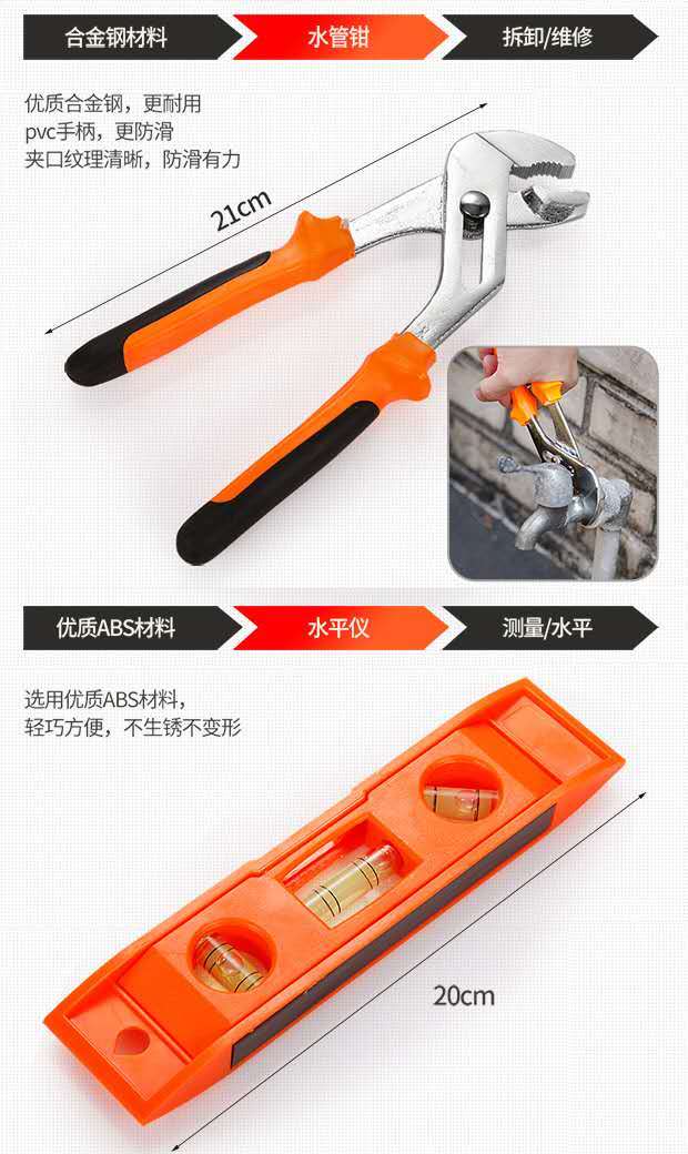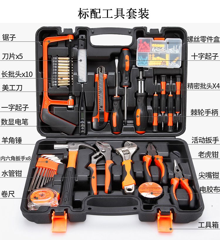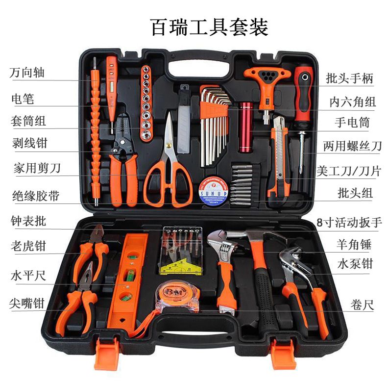 货收到了,物流很快,质量很好,正品保证,种类很全,包装很好,材质很好,物美价廉,做工完美,商家服务态度很好,工具非常实用,家庭必备,找了很多家,都是单卖不成套卖,终于有幸看到这里有我想要买的成套工具,还带工具箱,会回购的,一次完美又满意的购物体验,赞!