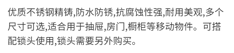 这锁扣的质量问题太差了,太粗糙了,随便摸一下就把手弄伤了,这万万不能要的,特别有幼儿的千万别买,怕嗤伤了小孩的嫩肉……