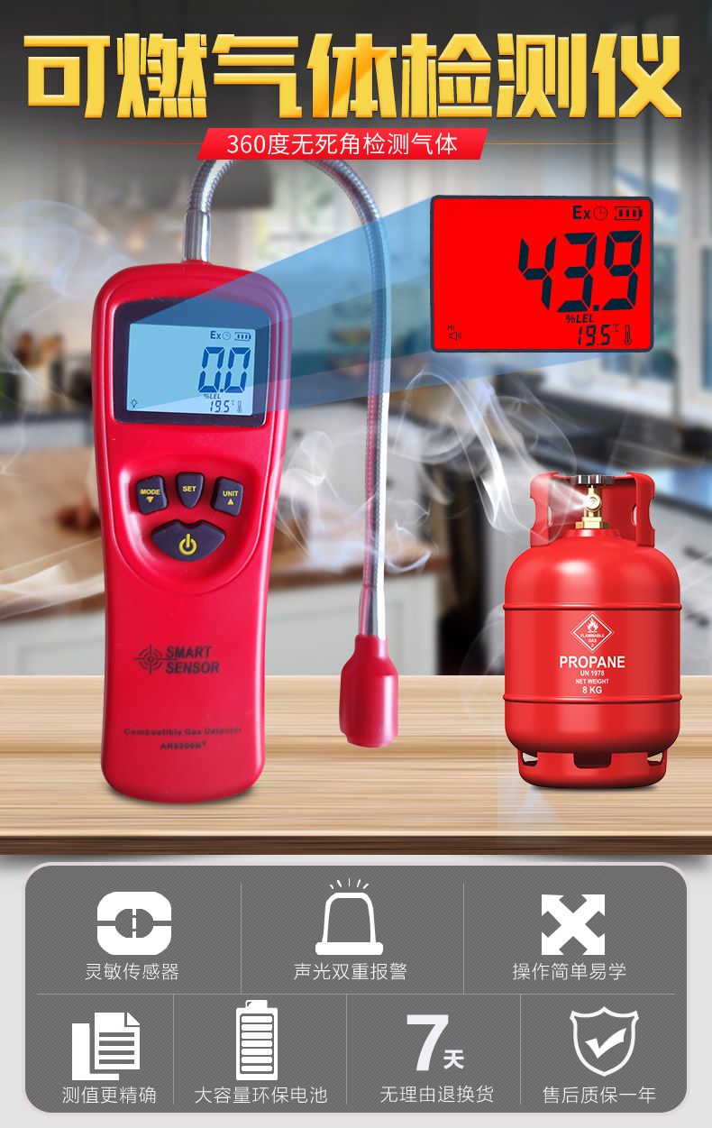 机器很灵敏,对着液化气管子测试立马测到并报警,真的很灵敏。