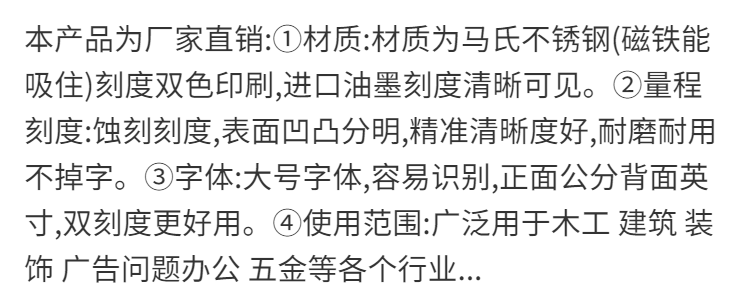多次购买,质量很好,用材厚实,刻度清晰,特别喜欢这种10CM红标钢尺,方便实用,店家发货用了木条保护,收到没有任何损坏,非常妥帖,1.2米长的,是用来自制裁剪台带刻度轨道挡条,非常好。
